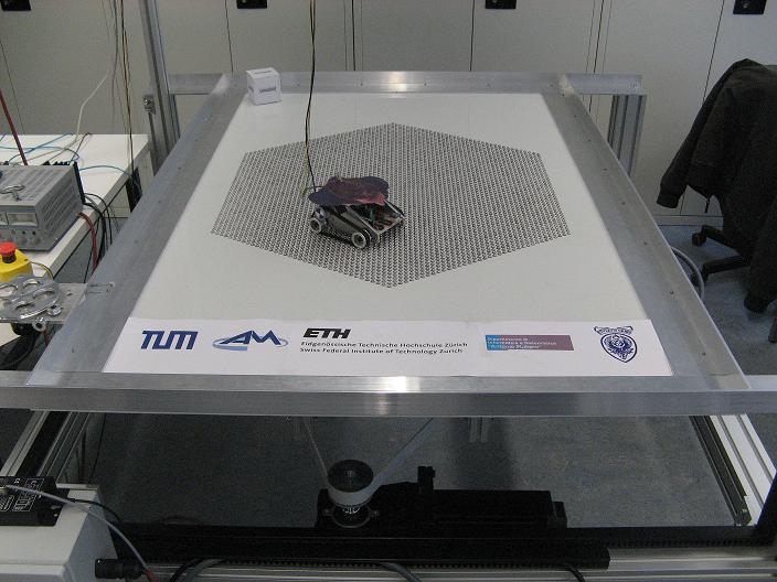 This page reports on the first experimental results obtained (in October 2006) from the integration of the activities of three CyberWalk partners: TUM, ETH, and ourselves (UOR). We tested our control laws on the small-scale ball array platform developed by TUM. A car-like robot carrying a picture of human head and shoulders represents the walking user. The position and orientation of the car are extracted from the images acquired by a fixed overlooking camera. The design and implementation of the visual tracking algorithm have been performed by ETH. |