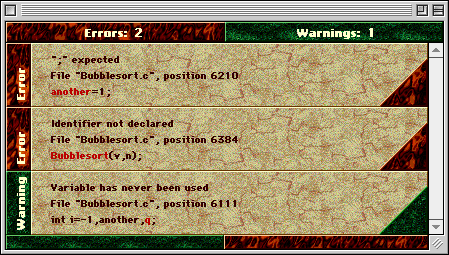 Note the error window is clickable: just click on an error (or warning) pane and you will jump to the text window containing the error, highlighted and ready to be corrected.