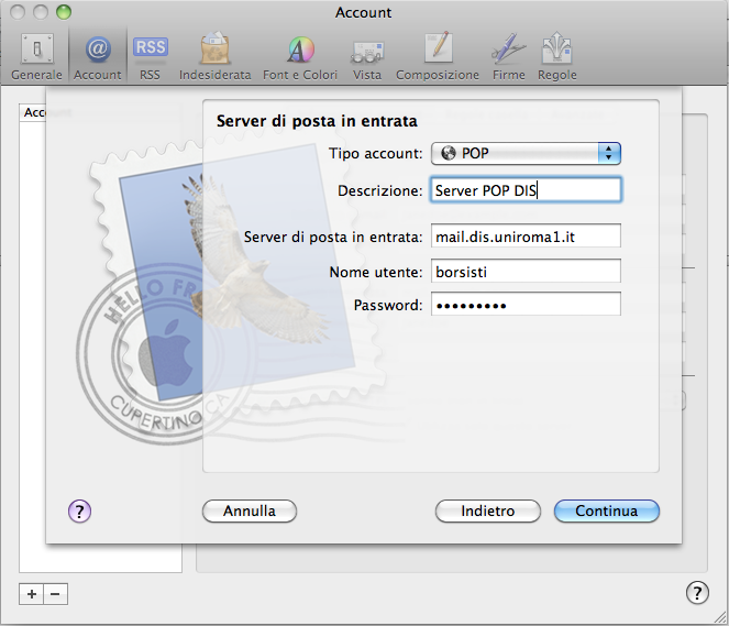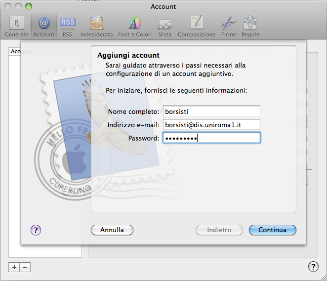 - Sarà visualizzata una finestra per l'inserimento dei parametri relativi all'indirizzo di posta. Fare clic su Continua