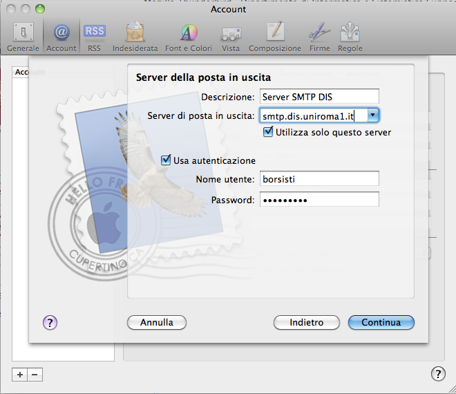 - Riempire le varie caselle di testo con le informazioni riportate in figura, inserendo il proprio nome utente e la propria password, fare quindi clic su Continua