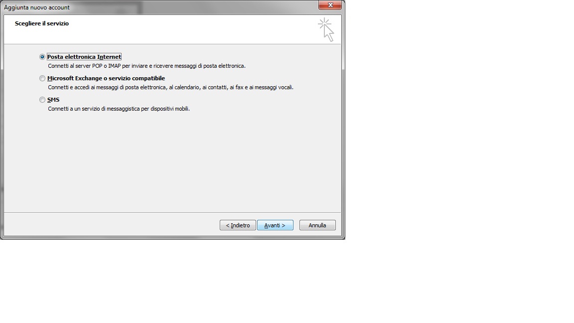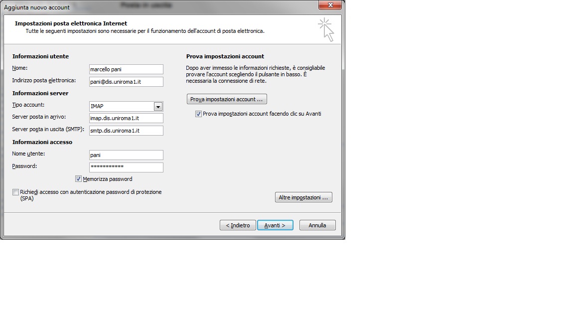 | Al primo avvio Microsoft Outlook propone la creazione di un nuovo account:Inserire i dati richiesti come mostrato in figura |