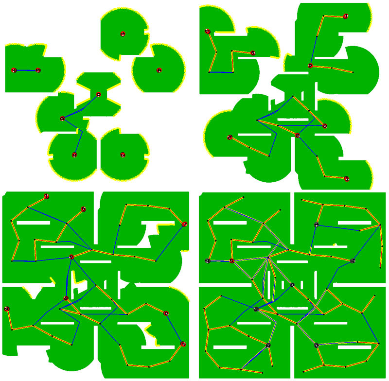 Realized within the Move3D (a powerful motion planning software environment realized at LAAS-CNRS) under the assumption of perfect (although limited-range) sensing and localization, these simulation clips highlight the performance of the Multi-SRG method for cooperative robot exploration.