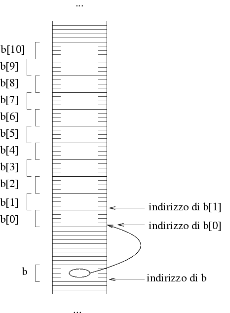 Quello che si è detto nella parte sui puntatori è che, se b è un puntatore a intero, allora *b si comporta come una variabile di tipo intero. Un altro modo di accedere alla zona di memoria è questo: se b è un puntatore a intero, allora b[0] è equivalente a *b. Questo significa che b[0] è la variabile la cui zona di memoria associata è costituita dai byte a partire dall'indirizzo contenuto in b.