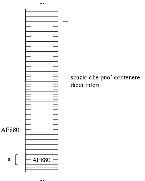 La funzione malloc mette a disposizione del programma una zona di memoria grande quanto il numero che riceve come argomento. In questo caso, la zona di memoria è larga 10*sizeof(int), ossia quanto basta per contenere dieci interi. Il valore di ritorno della funzione malloc è l'indirizzo iniziale della zona di memoria che è stata riservata per il programma. Nell'esempio, questa zona di memoria inizia dalla locazione AF880 (questo è un numero scritto in esadecimale). Questo numero viene messo nella variabile a. |