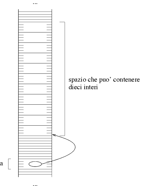 La freccia è semplicemente una notazione comoda per far vedere quale è l'indirizzo che sta scritto in una variabile puntatore. Occorre però sempre ricordare che si tratta di una semplice notazione, e che quello che effettivamente sta scritto nella variabile puntatore è un numero. Da questo momento in poi, si può usare a come se fosse un array statico. Per esempio, si possono usare a[0], a[1] ecc. come se a fosse un array statico. In particolare, a[0] è memorizzata nei primi quattro byte della memoria allocata da malloc, a[1] nei successivi quattro, ecc. |