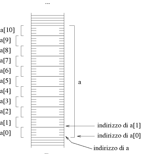 In questa e in alcune pagine successive, si parla di dimensione di un vettore, intendendo il numero di elementi che lo compongono. Per esempio, il vettore dichiarato con int a[10]; è composto da 10 elementi, quindi ha dimensione 10. Per indicare il risultato della sizeof, usiamo invece il termine ``numero di byte occupati''. Il alcuni testi si può trovare ``dimensione'' come sinonimo dello spazio occupato da una variabile. Il contesto permette di solito di capire di cosa si sta parlando.