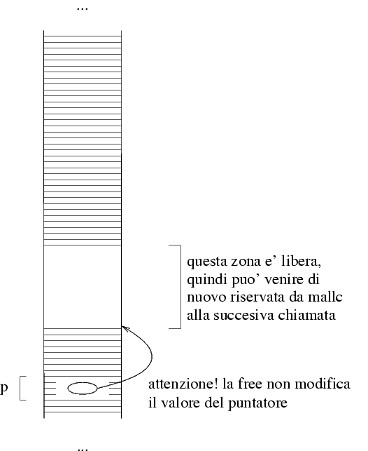 Nota: la funzione free, dal momento che il puntatore viene passato per valore, non può modificare il valore del puntatore, quindi il puntatore non vale NULL dopo la chiamata. Nel puntatore c'è ancora l'indirizzo della zona precedentemente allocata. Dal momento che questa zona è ora libera, può venire riallocata e modificata, quindi ogni accesso a questa zona (usando p[i] oppure *p) è da considerarsi un errore di programmazione.