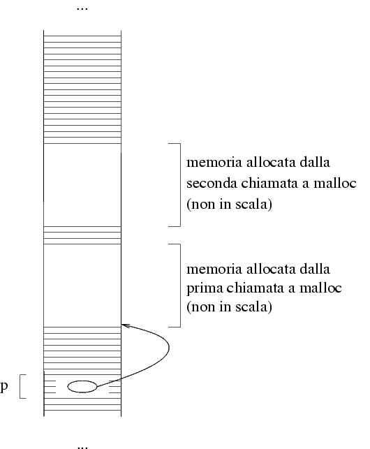Lo stato della memoria dopo la prima chiamata alla funzione malloc è quella a fianco per tutti e due i programmi: le zone di memoria riservate (non libere) sono quella di p e quella che è stata riservata dalla funzione malloc Quando si fa la seconda chiamata, la memoria che è stata allocata in precedenza risulta riservata, quindi la funzione malloc è costretta a usare una differente zona di memoria, che viene a sua volta riservata. Lo stato della memoria è quindi quello qui sotto. |