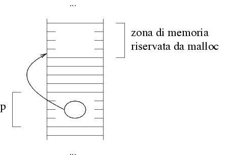 Un'altra osservazione importante che si puè fare su questo programma è che non è più possibile accedere alla prima zona di memoria, quella creata dalla prima chiamata di malloc. Infatti, l'unico modo per accedere a una zona di memoria è quello di conoscere il suo indirizzo, ma l'indirizzo di questa zona era stato memorizzato in p e poi sovrascritto. Il programma non può quindi sapere quale è l'indirizzo di questa zona, e non può quindi accedere ad essa.