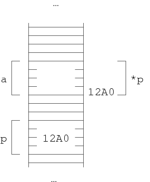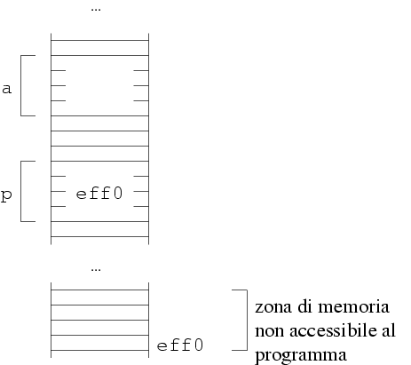 Facciamo ora una precisazione sulla rappresentazione grafica della memoria. Nella figura di sopra abbiamo messo dei valori numerici di esempio per rappresentare gli indirizzi delle variabili (eff0b per l'indirizzo di a e eff12 per l'indirizzo di p). Va tenuto sempre presente che questi sono solo indirizzi di esempio: se si esegue il programma una seconda volta, potrebbero venire stampati degli indirizzi diversi, per esempio ffb02 ed ffb12. Nel seguito, si mettono comunque dei valori specifici per gli indirizzi, ma va tenuto presente che si tratta solo di valori di esempio.