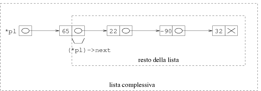 Vediamo ora il passo ricorsivo. Per prima cosa, scriviamo la intestazione della funzione. La lista va passata per indirizzo, dato che, nel caso di lista di un solo elemento, il puntatore iniziale va alterato. Quindi, abbiamo la seguente intestazione: void EliminaUltimoRicorsiva(TipoLista *pl). La ipotesi ricorsiva, in questo caso, è che la funzione realizza la cancellazione dell'ultimo elemento, quando viene passato il resto della lista. In altre parole, si assume che la chiamata ricorsiva sul resto della lista EliminaUltimoRicorsiva(& (*pl)->next ) effettivamente cancelli l'ultimo elemento dal resto della lista. Dalla rappresentazione grafica si capisce che eliminare l'ultimo elemento dal resto della lista, effettivamente lo elimina anche dalla lista complessiva. Supponiamo quindi che la lista passata sia la seguente: