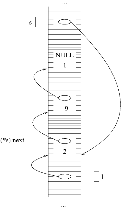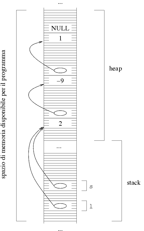 Finora abbiamo disegnato la memoria senza fare distinzioni fra le variabili e le zone di memoria allocate con malloc. Un esempio di figura fatta in questo modo è la seguente: