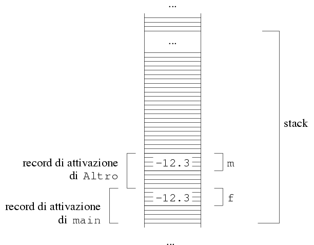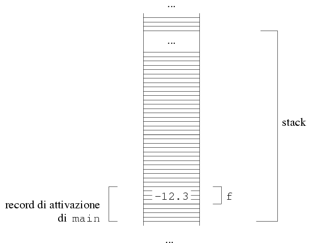 La struttura dello heap non ci interessa. Ci basta sapere che questa è la zona che contiene tutte le zone di memoria allocate con malloc. È invece importante capire in che modo è fatto lo stack. La struttura è la seguente: per ogni funzione, c'è una zona di memoria in cui si trovano le variabili locali della funzione. In particolare, la zona di memoria per la funzione main (ossia quella che contiene le variabili del programma principale) si trova nel punto più basso dello stack. Ogni volta che si chiama una funzione, viene creata una zona di memoria immediatamente sopra, e questa zona contiene le variabili locali della funzione chiamata (incluse le variabili che rappresentano i parametri). La zona di memoria che viene creata per una singola funzione viene detta record di attivazione. Consideriamo il seguente esempio: