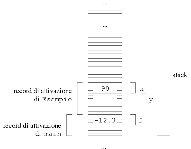 Quando si esegue anche la funzione Esempio, viene creato un altro record di attivazione, che viene messo immediatamente sopra. Questo record di attivazione contiene sia le variabili che rappresentano i parametri formali della funzione (in cui vengono immediatamente scritti i valori passati) che le variabili locali del programma.