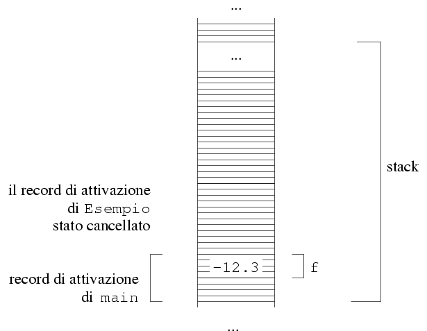 Ogni volta che una funzione termina, il suo record di attivazione viene cancellato. Nel caso di sopra, quando la funzione Esempio, termina, il record di attivazione che era stato creato per essa viene rimosso dallo stack: