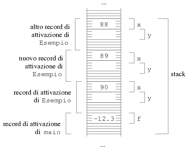 Nella nuova variabile x viene messo il valore che è stato passato, ossia 88. La cosa va avanti cosí: ogni volta che si chiama una funzione, si crea per essa un nuovo record di attivazione che viene messo subito sopra i precedenti. Ogni volta che si attiva una funzione, questa ``vede'' le variabili che stanno scritte nel suo record di attivazioni. Per esempio, la prima attivazione di Esempio vede la x che contiene 90, la seconda vede la x che contiene 89, ecc.