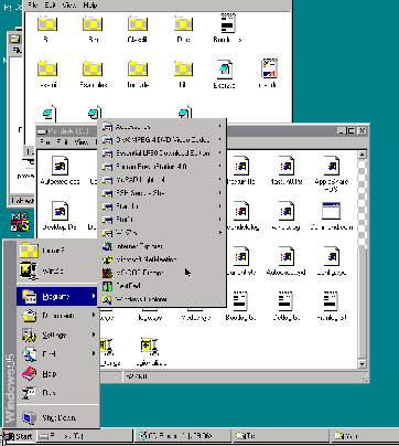 La figura rappresenta un esempio di immagine video durante una sessione di lavoro in WINDOWS. Oltre alle icone, notiamo anche dei contenitori di icone, le finestre. In figura sono rappresentate due finestre. Una finestra è uno spazio delimitato all'interno dello schermo. Ad ogni finestra è assegnato un nome.