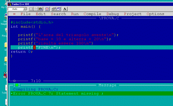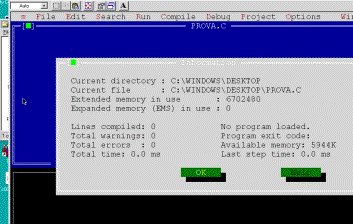 Se il programma è corretto appare il messaggio “Compile successful”, altrimenti può comparire un messaggio di errore (in rosso), e il cursore si posiziona sull’istruzione che ha causato l’errore, o su una delle successive. Quando compare un messaggio di errore, se si vogliono maggiori spiegazioni su tale errore si può premere F1. Dopo bisogna premere ESC per tornare nella finestra di edit (cioè sul testo del programma)
