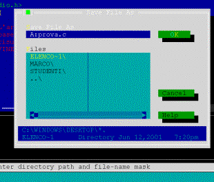 È possibile a questo punto rientrare nel Turbo C, secondo le modalità spiegate nella sezione 1.4, e caricare di nuovo lo stesso programma dal disco, per eseguirlo nuovamente o modificarlo: nel menù FILE è presente il comando Open che serve a questo scopo. Ovviamente è necessario scrivere, nell'apposito spazio dell'apposita finestra, il nome assegnato precedentemente al programma (cioè il nome del file in cui il programma era stato salvato con il comando Save). La finestra di Open appare quando il comando Open e' stato selezionato.