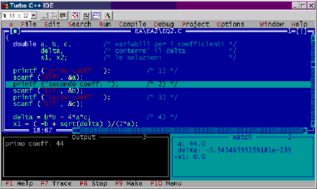 Un programma TurboC può essere eseguito una linea alla volta, premendo ripetutamente il tasto F7 ("trace”) oppure il tasto F8 (“step”).