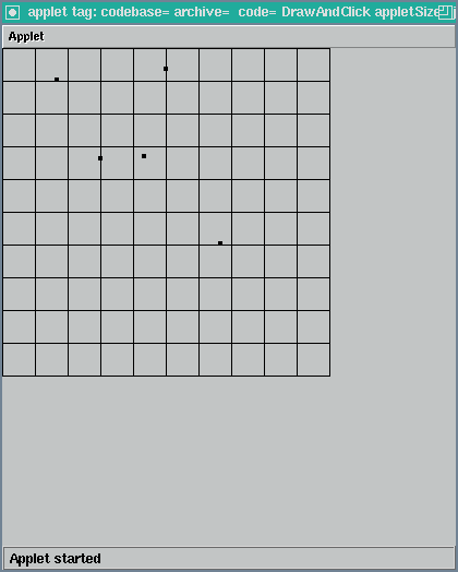 Realizziamo un applet che disegna prima una griglia di linee a distanza 30 l'una dall'altra, e poi disegna un quadratino in ogni punto in cui viene premuto il pulsante del mouse.