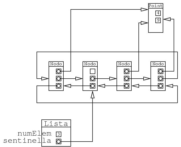 Gli oggetti ListaDoppia hanno due campi: il numero di elementi e un riferimento a un qualsiasi oggetto dell'anello: