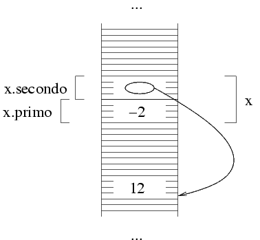 In altre parole, la variabile x è una struttura con due campi: è composta da una variabile intera x.primo, e da un puntatore x.secondo. Ricordiamo che un puntatore è semplicemente un numero, che rappresenta un indirizzo di memoria. In questo caso, la zona di memoria indicata da questo puntatore va interpretata come un intero. Naturalmente, non esiste nessuna garanzia, a priori, che questa zona contenga effettivamente il secondo numero della sequenza. Allocare la memoria e metterci il secondo intero è compito del programmatore. |