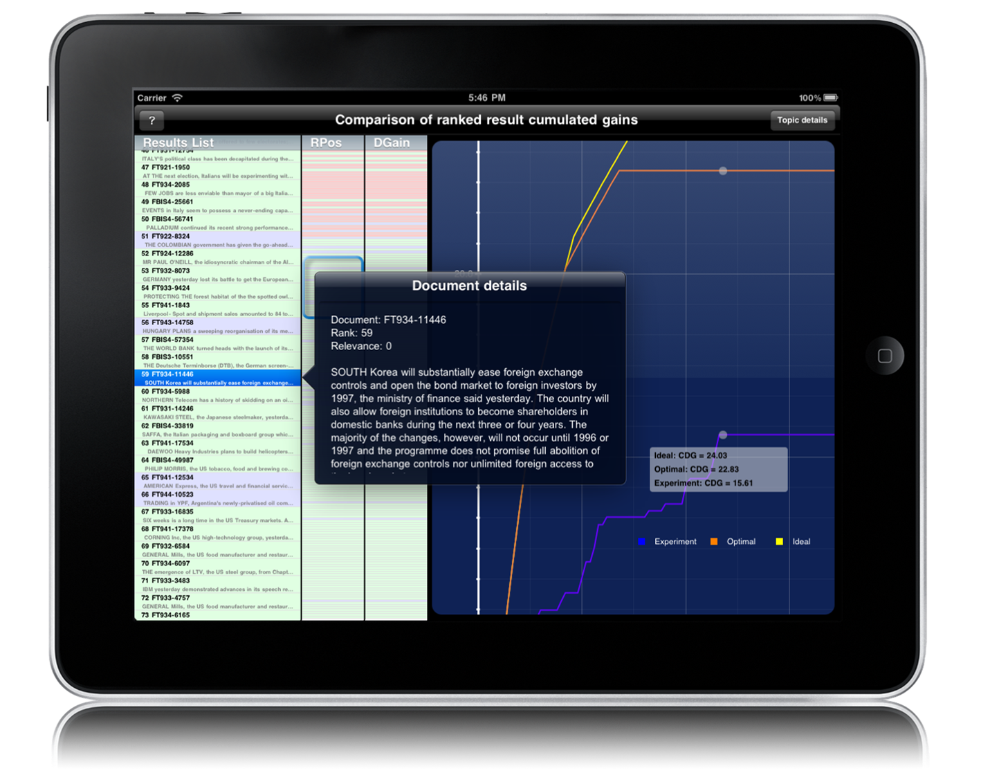 All'interno di PROMISE il nostro gruppo svolge, in collaborazione con gli altri partner del progetto, un' intensa attività di ricerca che mira a creare nuovi strumenti di analisi visuale che supportino la valutazione di sistemi di information retrieval e aiutino i ricercatori a comprendere le cause dei malfunzionamenti e ad intervenire per migliorare. Questa attività, che ha portato alla realizzazione del prototipo mostrato nella figura a fianco, è documentata nei seguenti articoli: